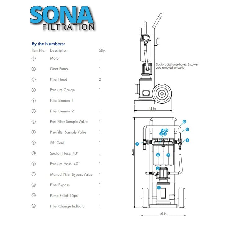 - Filter cart accepts a variety of filter replacements: 3, 5, 10, and 25 micron, and/or water removal